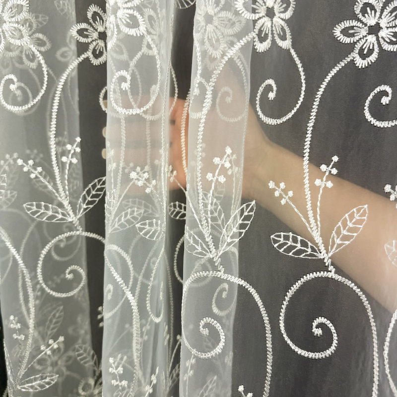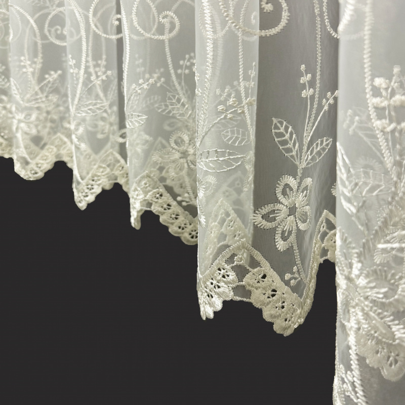 Mírně průhledná voálová látka s bohatou květinovou výšivkou v krémové barvě.