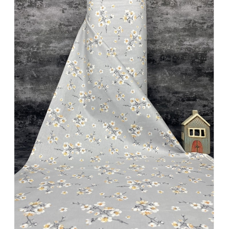 Tato bavlněná látka o šířce 240 cm je zdobena jemným motivem květů jabloně na šedém podkladu. Bílé květy s oranžovými tyčinkami a černými detaily vytvářejí elegantní a sofistikovaný vzhled. Ideální pro různé textilní projekty, jako jsou závěsy, ložní prádlo nebo dekorativní polštáře.