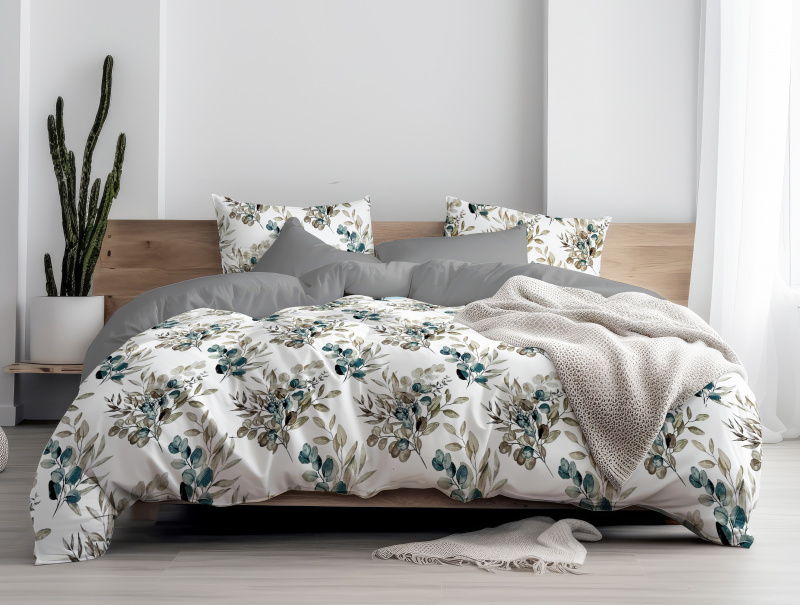 Ervi Bavlněné povlečení oboustranné - eukalyptové větvičky/šedé