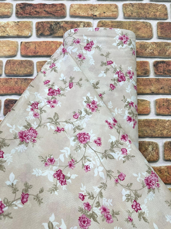 z jedné strány vzor romantické růže z druhé jednobarevná látka v světle hnědé barvě.