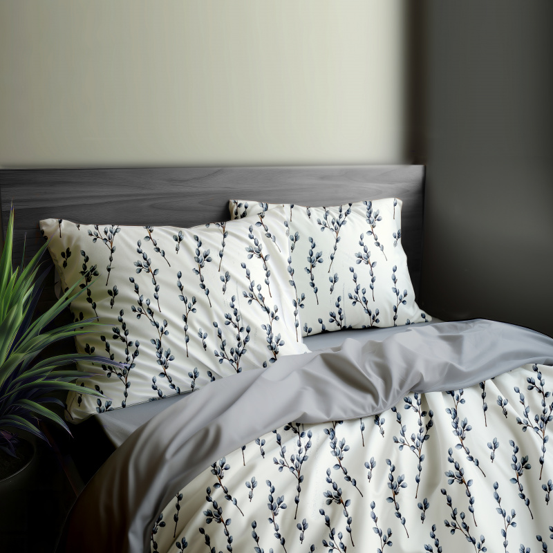 Toto povlečení je inspirováné přírodou a přinese do vaší ložnice harmonii a klid. Bílý podklad je zdoben jemnými větvičkami vrby jívy s modrošedými kočičkami, které vytvářejí uklidňující a nadčasový vzor.
