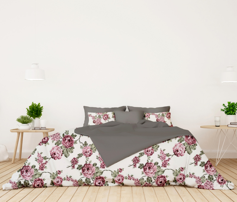 Ervi bavlněné povlečení oboustranné - růžové květy na bílém/šedé