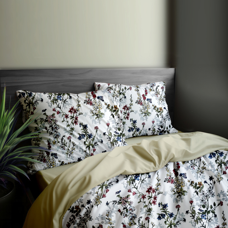 Toto povlečení je vyrobeno z kvalitní bavlny a je oboustranné. Na jedné straně je vzor malovaných lučních květin na bílém podkladu, zatímco druhá strana je jednobarevná béžová. Povlečení zahrnuje povlak na peřinu a dva povlaky na polštáře, které mají stejný květinový vzor jako peřina. Tento design přináší do ložnice svěžest a přírodní krásu, což je ideální pro milovníky přírodních motivů a elegantního stylu.