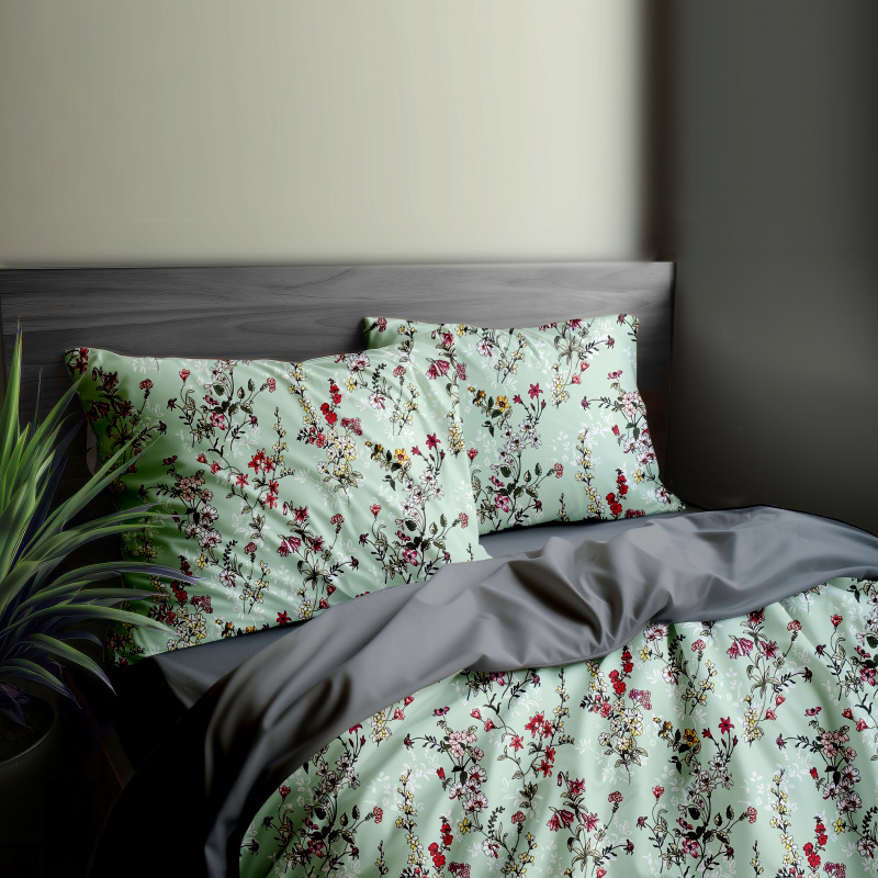 Toto povlečení je vyrobeno z kvalitní bavlny a nabízí oboustranný design. Jedna strana je zdobena jemným vzorem malovaných lučních květin na světle zeleném podkladu, zatímco druhá strana je jednobarevná v šedém odstínu. Tento produkt je ideální pro ty, kteří chtějí do své ložnice vnést nádech přírody a elegance.