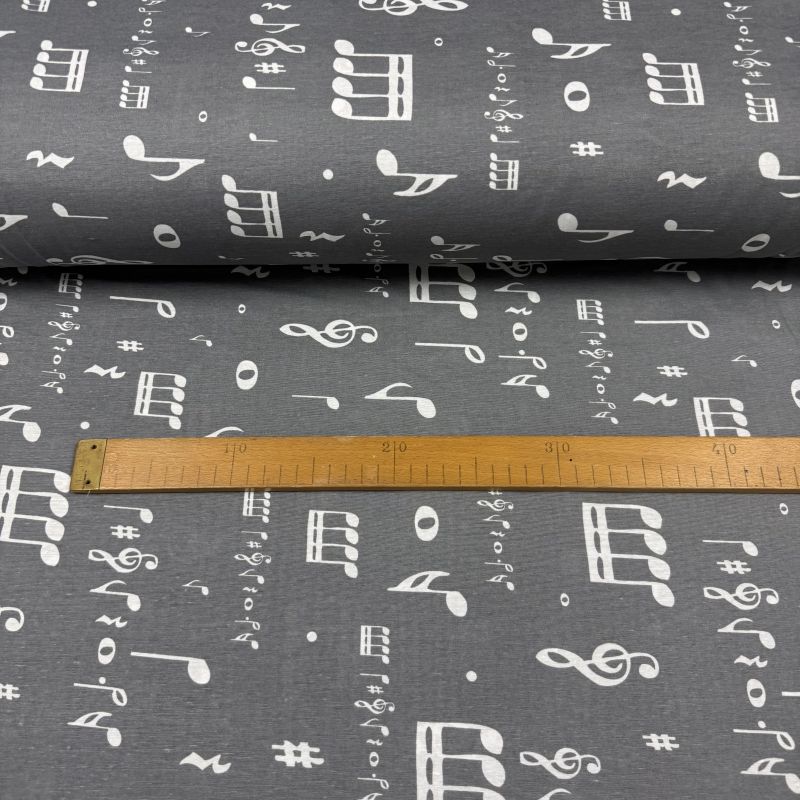 z jedné strány Music Style z druhé jednobarevná látka v šedé barvě.