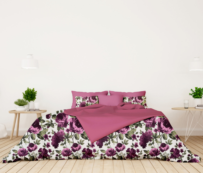Bavlněné oboustranné povlečení s nádherným květinovým vzorem fialových hortenzií a pivoněk na bílém podkladu. Druhá strana je jemná jednobarevná růžová, která dodává ložnici elegantní a romantický vzhled.