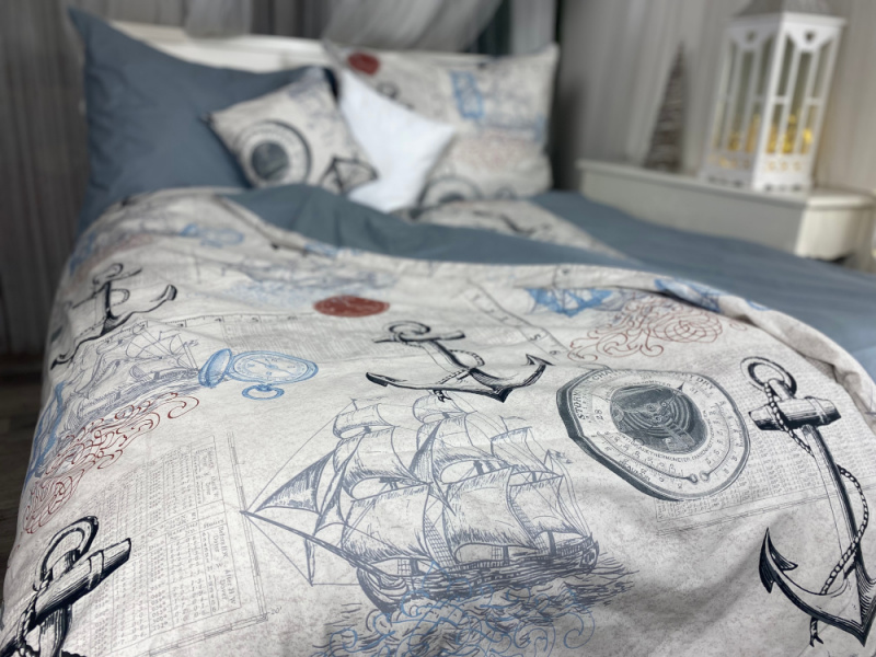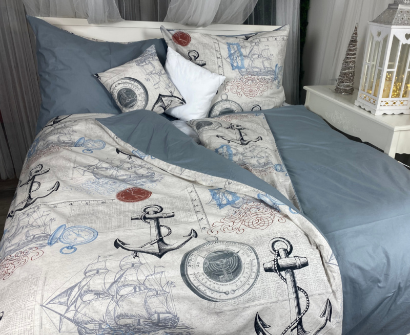 "Bavlněné povlečení oboustranné - mořský vzor/šedé. Toto stylové povlečení je vyrobeno ze 100% kvalitní přírodní bavlny, která zajišťuje měkkost, odolnost a pohodlí. Oboustranný design nabízí dvě možnosti vzhledu – jedna strana je zdobena námořním vzorem, který zahrnuje kotvy, lodě, kompas a další motivy v modré, červené a černé barvě, zatímco druhá strana je jednobarevná šedá. Povlečení přináší do ložnice svěží a moderní vzhled, ideální pro milovníky námořních motivů. Snadno se udržuje, což z něj činí perfektní volbu pro každodenní použití i speciální příležitosti. Skvělý doplněk do vašeho domova nebo originální dárek, který potěší kvalitou a estetickým provedením."