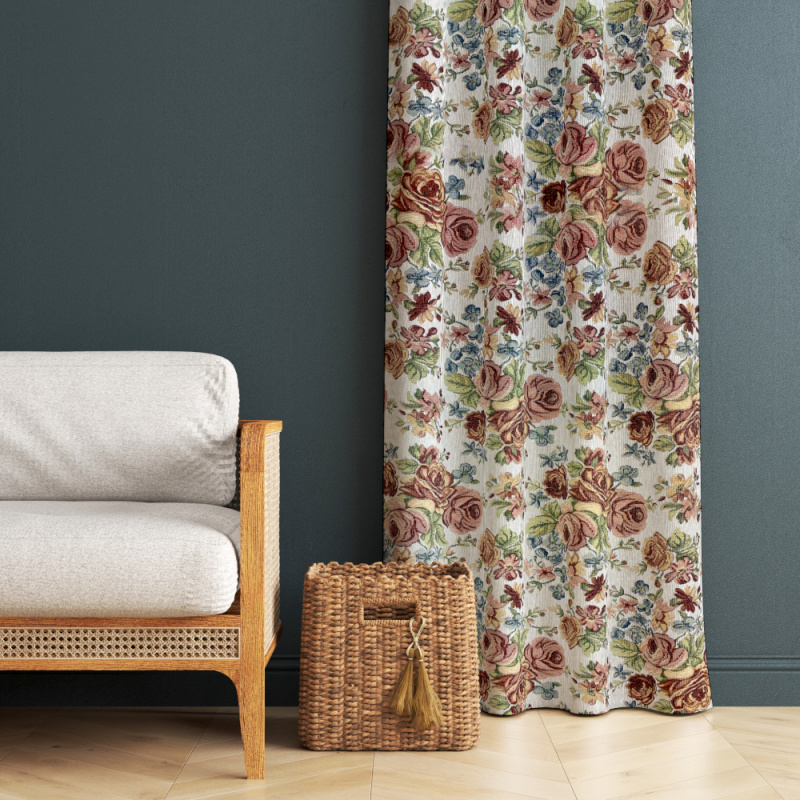 Gobelínový termo závěs s názvem "Gold plus růže cream" je elegantní a dekorativní doplněk pro váš interiér. Závěs má krémovou barvu s bohatým květinovým vzorem, který zahrnuje růže v různých odstínech růžové, červené a zelené. Tento závěs je vyroben z kvalitního gobelínového materiálu, který zajišťuje tepelnou izolaci a pomáhá udržet teplo v místnosti, čímž zamezuje průniku chladu.