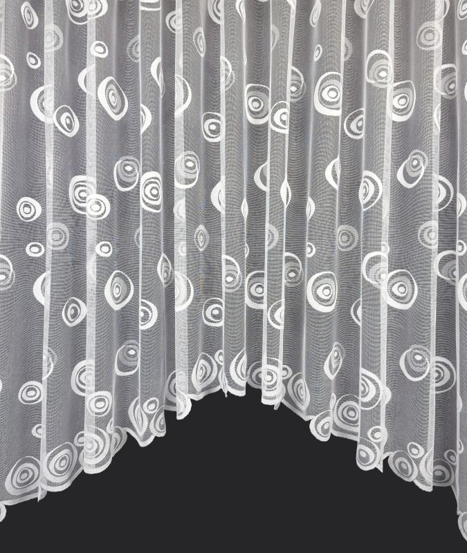 Zdobená žakárová záclona v bílé barvě tvarovaná do oblouku s našitou řasící páskou 2,5 cm.