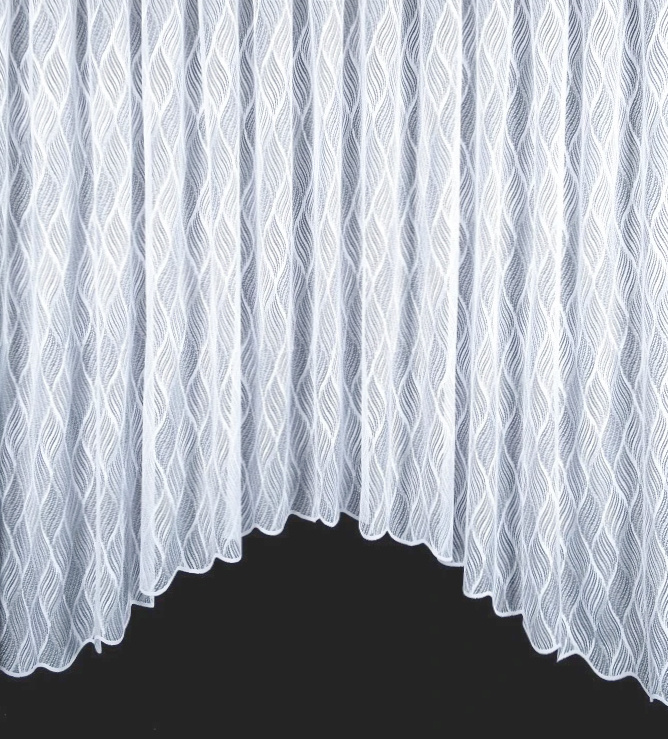 Zdobená žakárová záclona v bílé barvě tvarovaná do oblouku s našitou řasící páskou 2,5 cm.