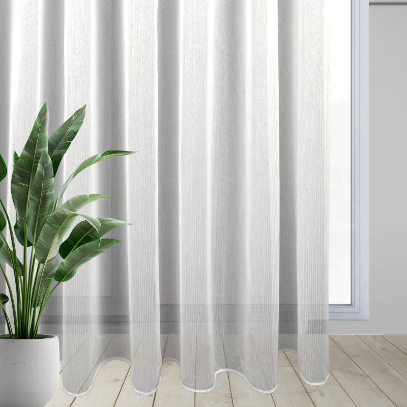 Je vyroben z jemné, průsvitné bílé tkaniny s decentním svislým proužkovým vzorem, která dodává prostoru světlost a lehkost.