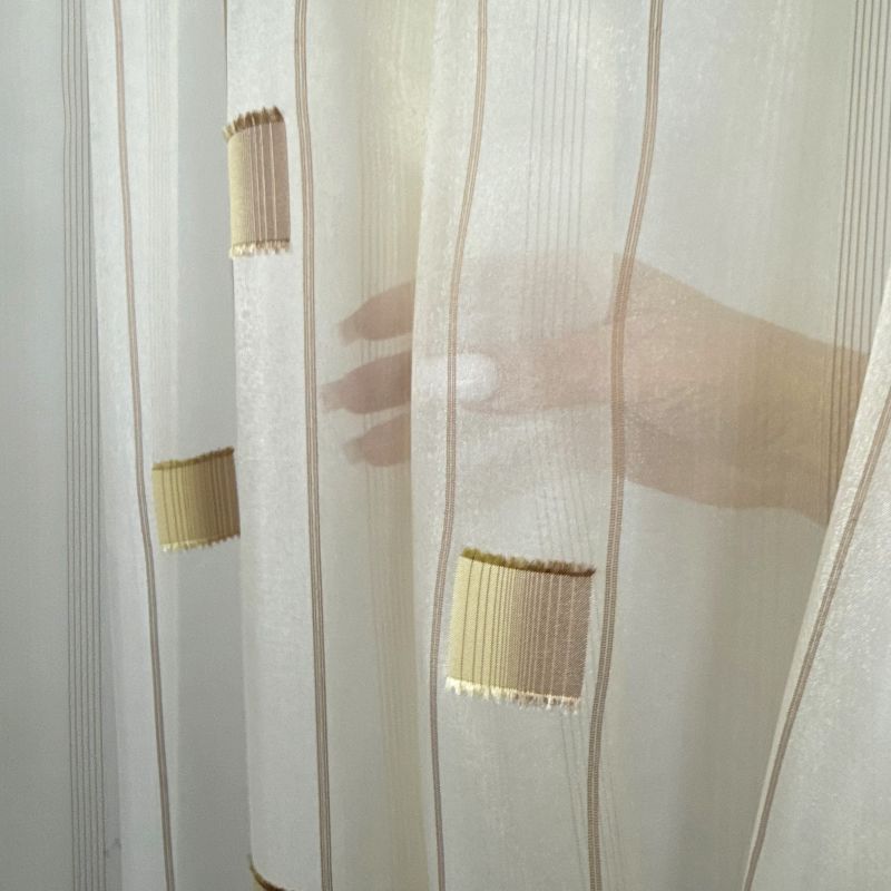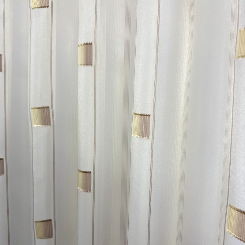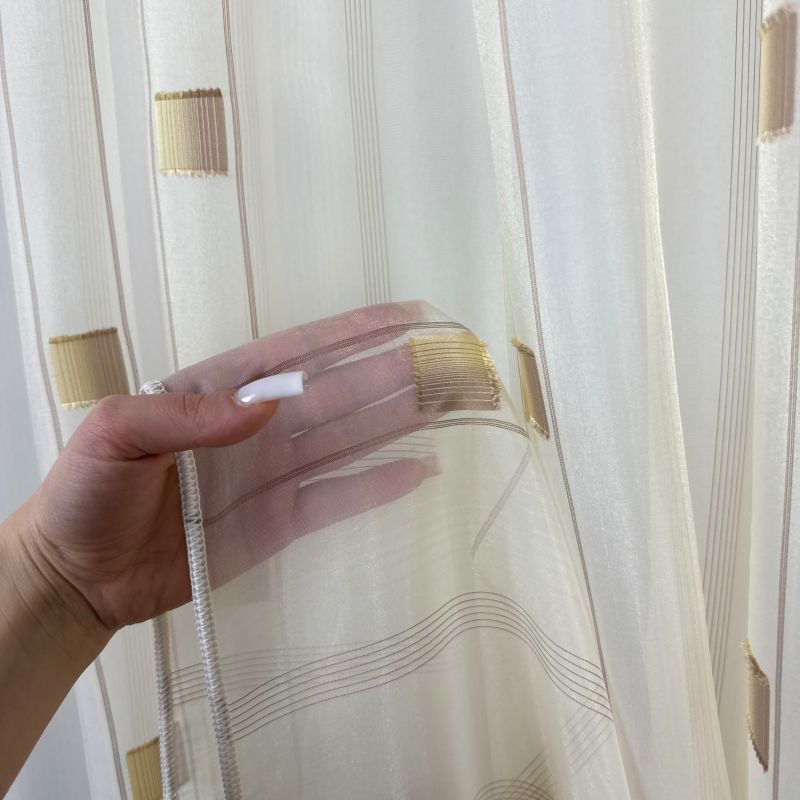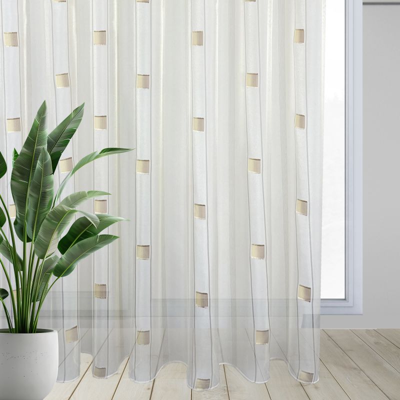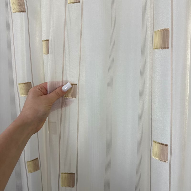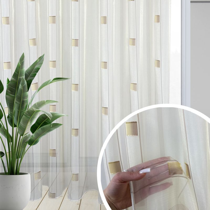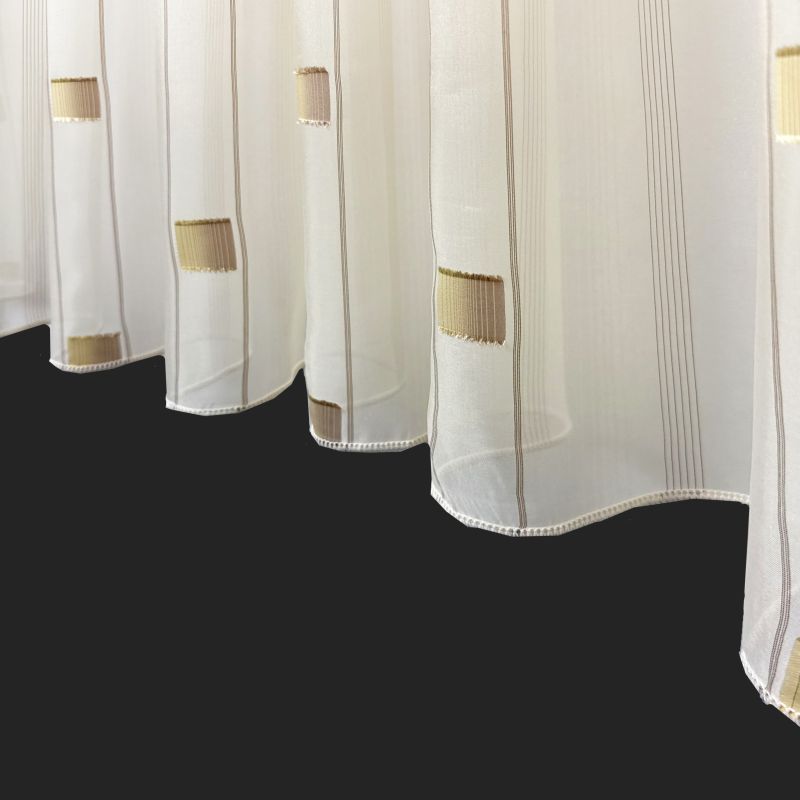 Voálová látka / záclona SANDRA 0166-04 hnědo béžová je elegantním a moderním doplňkem pro váš interiér. Tato záclona je vyrobena z jemného průsvitného voálu, který propouští dostatek světla a zároveň zajišťuje soukromí. Design zahrnuje decentní geometrický vzor tvořený hnědými čtverci, které dodávají zácloně stylový a zajímavý vzhled. Hnědo-béžové barevné provedení zajišťuje snadnou kombinaci s různými druhy dekorací a nábytku.