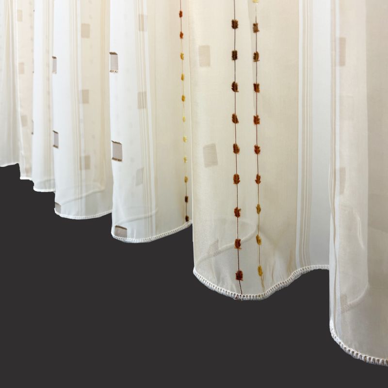 Voálová záclona v kombinaci barev hnědá a bílá s vetkanými barevnými kostičkami a nití s olůvkem.