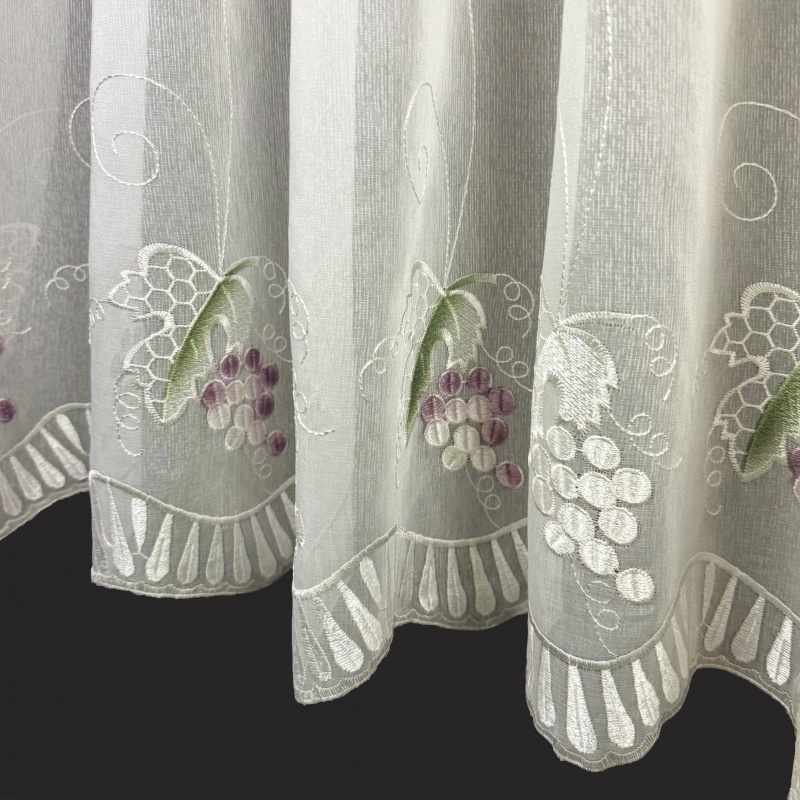 Voálová záclona v smetanové barvě s výšivkou s motivem hroznového vína. Zavěšení na žabky, po našití řasící pásky lze zavěsit na háčky.