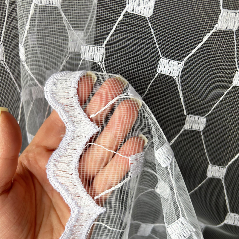 Vyšívaná záclona bílá 3010, metráž, je dokonalým doplňkem každého interiéru. Tato záclona je vyrobena z kvalitního bílého materiálu a zdobena jemným geometrickým vyšívaným vzorem, který vytváří moderní a elegantní vzhled. Průhledná struktura záclony propouští dostatek světla, přičemž vzor zajišťuje příjemné soukromí. Dekorativní lemování na spodním okraji dodává zácloně na sofistikovanosti.