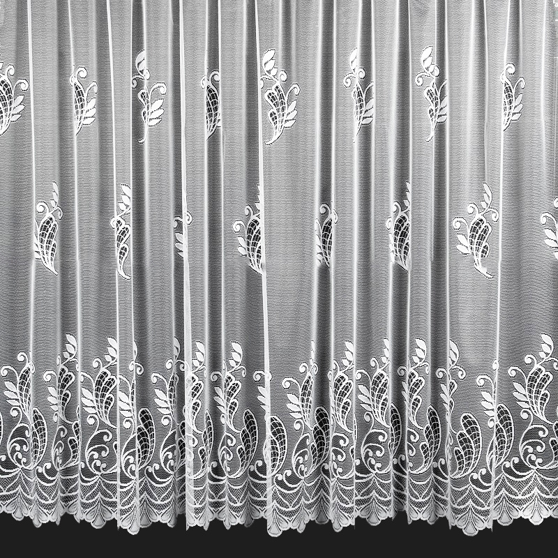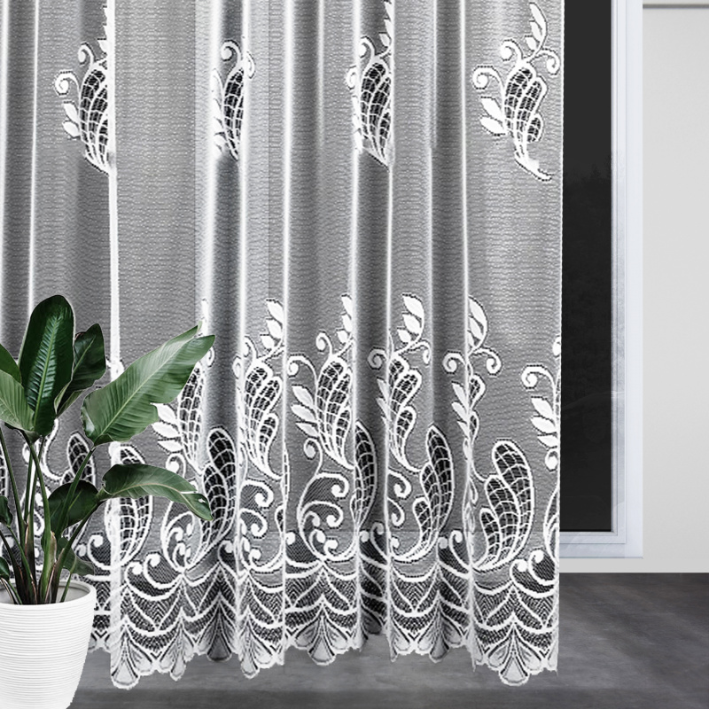 Žakárová záclona bílá 4959, metráž, je vyrobena z jemného bílého žakárového materiálu. Tato záclona má elegantní vzor, který zahrnuje složité listové a květinové motivy, rovnoměrně rozmístěné po celé ploše záclony. Spodní okraj záclony je zdobený bohatým ornamentálním vzorem, který dodává zácloně luxusní vzhled. Tento produkt je ideální pro přidání sofistikovaného a stylového prvku do jakéhokoli interiéru, jako jsou obývací pokoj, ložnice, kuchyně nebo kancelář. Dostupná je v metráži, což umožňuje přizpůsobení délky podle potřeby zákazníka.