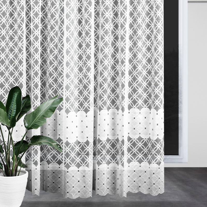 Žakárová záclona bílá 7324, metráž, je vyrobena z kvalitního žakárového materiálu a má elegantní bílou barvu. Vzor záclony je tvořen pravidelnými geometrickými tvary, které dodávají zácloně moderní a stylový vzhled. Spodní okraj záclony je zdobený širším pruhem s jemnými detaily, které zvyšují její estetickou hodnotu. Tato záclona je ideální pro použití v obývacím pokoji, ložnici nebo kuchyni, kde přidá nádech elegance a sofistikovanosti.