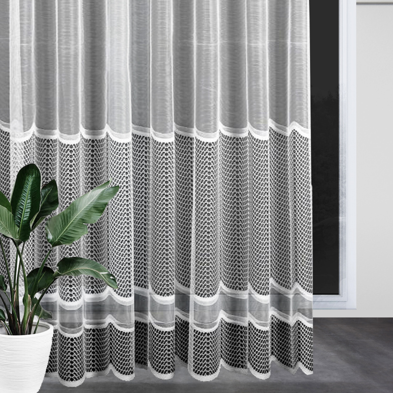 Žakárová záclona bílá 7378, metráž, je vyrobena z jemného bílého žakárového materiálu. Tato záclona je elegantně navržena s horizontálními pruhy a jemnými geometrickými vzory, které dodávají místnosti sofistikovaný vzhled. Je průsvitná, což umožňuje dostatek světla do místnosti, zatímco stále poskytuje soukromí. Ideální pro použití v obývacích pokojích, ložnicích nebo jiných obytných prostorech.
