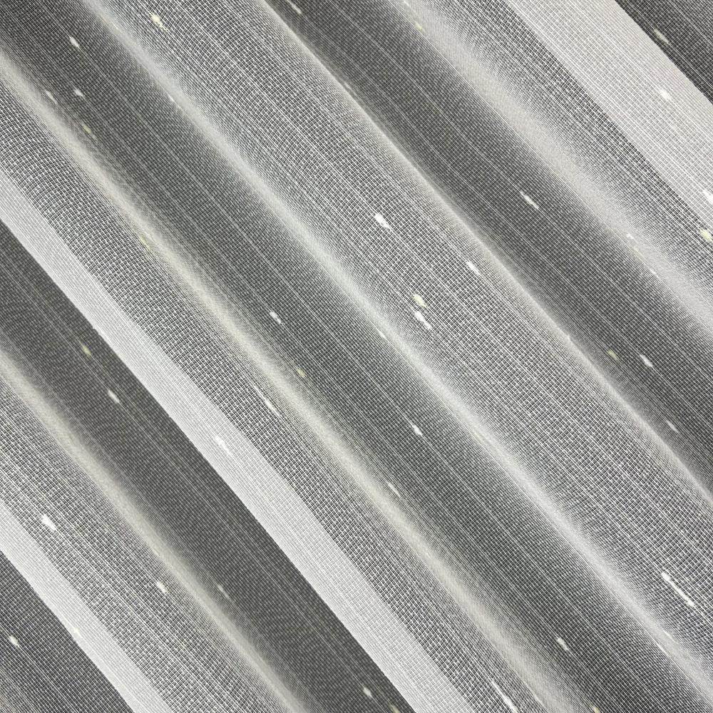 Struktura látky připomíná tenkou síťovinu, na které jsou nepravidelně rozmístěny malé bílé body nebo vlákna v bílé a smetanové barvě, což vytváří zajímavý textilní efekt.