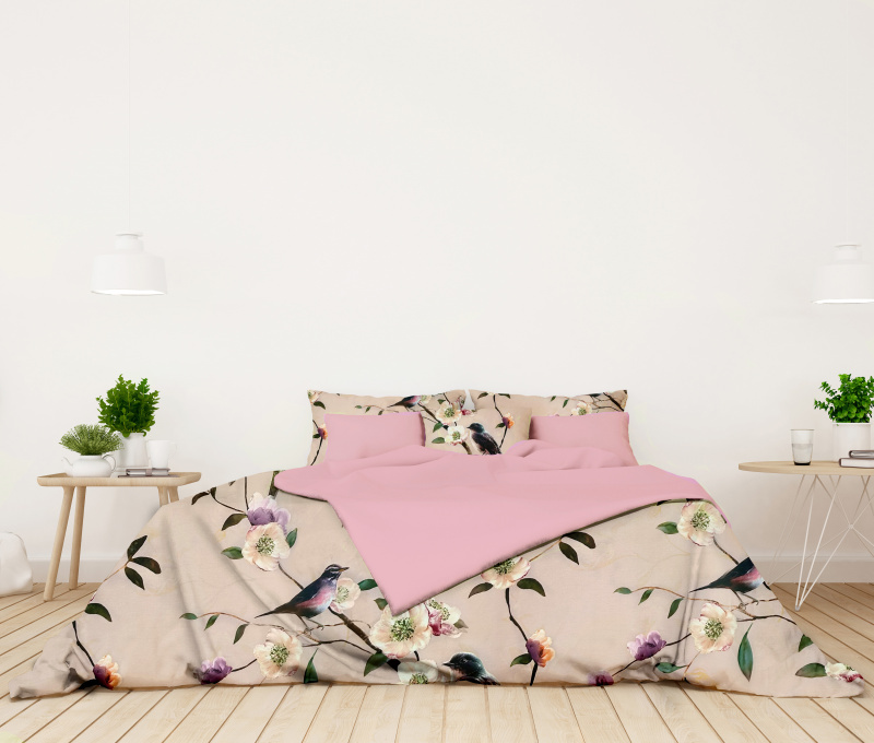 Ervi Zvýhodněná Sada Bavlněného Saténového DUO povlečení s Prostěradlem - Ptáček/růžové