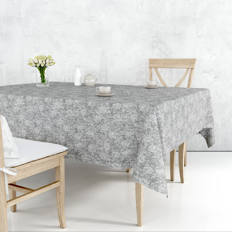 Elegantní design inspirovaný jemnou krajkou a romantickými růžemi. Tlumené šedobílé tóny dodávají ubrusu nádech klasiky a nadčasové krásy. Perfektní volba pro slavnostní i každodenní stolování.