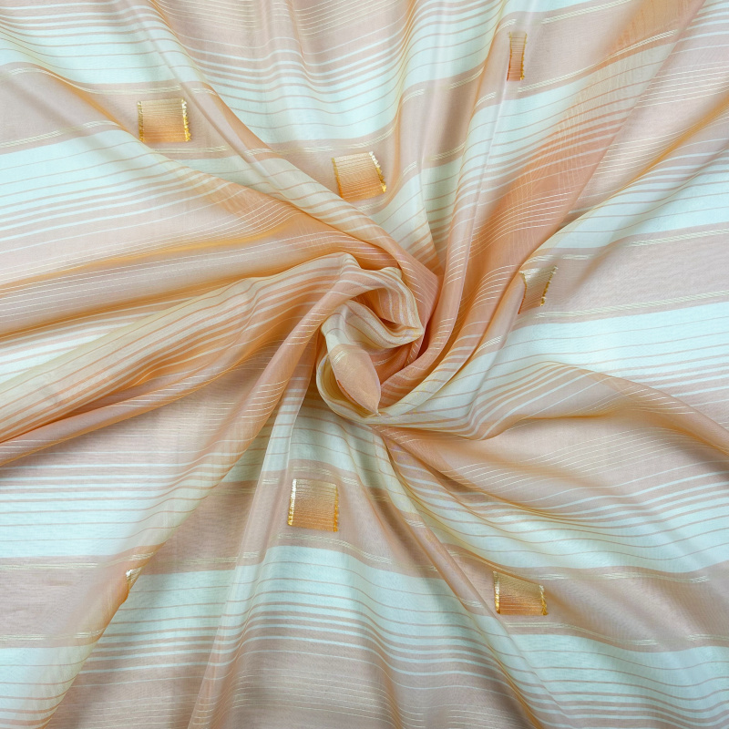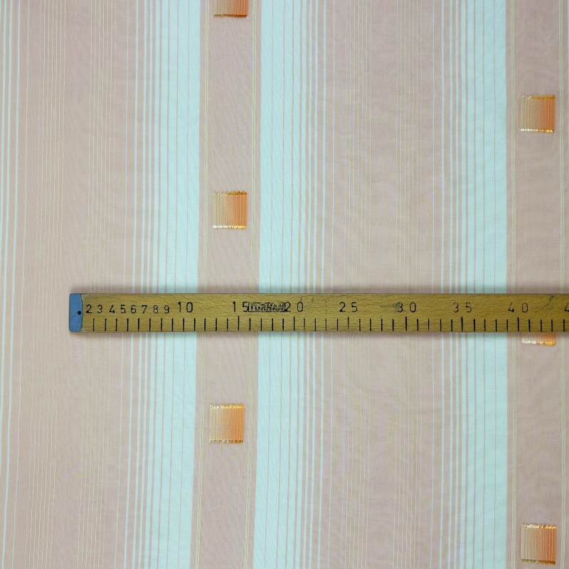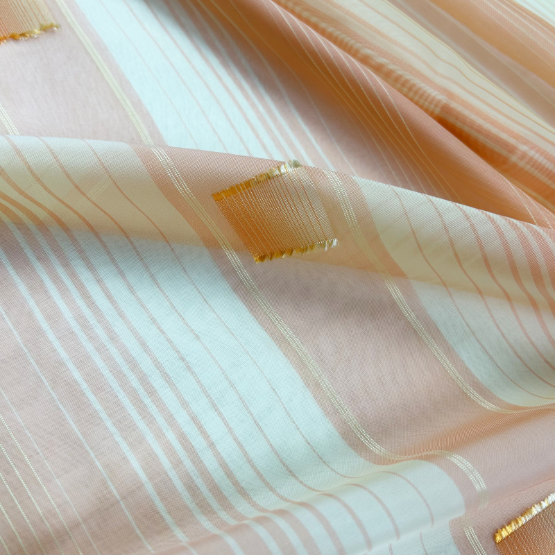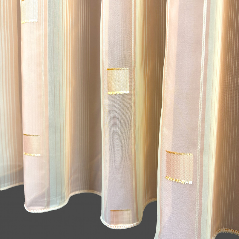 Průhledná voálová záclona v kombinaci barev světlé-žluté a meruňkové barev se svislými proužky a lesklými vetkanými čtverci.