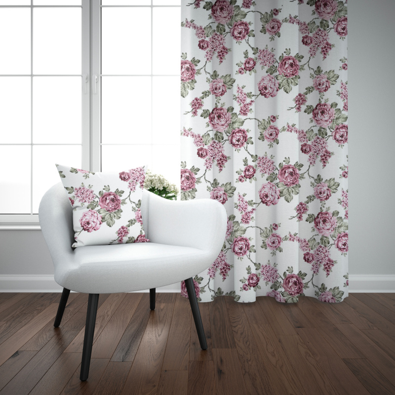 Ervi bavlněný závěs - růžové květy na bílém