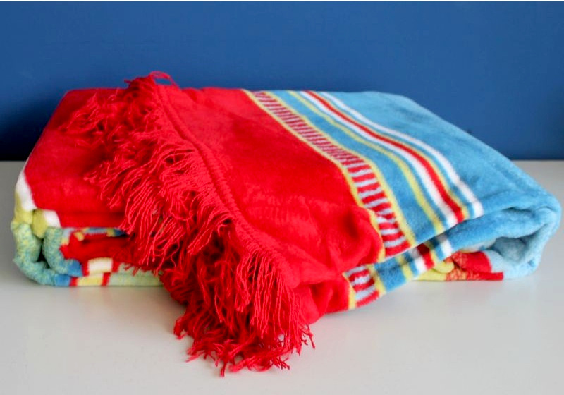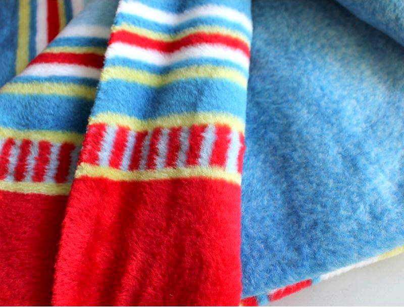 Krasná deka s pruhovaným vzorem v kombinací barev modrá, světle modrá, světle zelená, bílá, červená