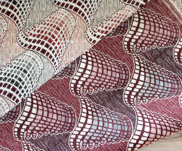 Dekorační/potahová gobelínová látka Asetat - 156 je látka s opakujícím se vzorem, který připomíná abstraktní geometrické tvary. Vzor je tvořen různými odstíny červené, šedé a bílé barvy, které se pravidelně střídají a vytvářejí zajímavý geometrický efekt. Látka je vhodná pro dekorativní účely nebo jako potahový materiál na nábytek.