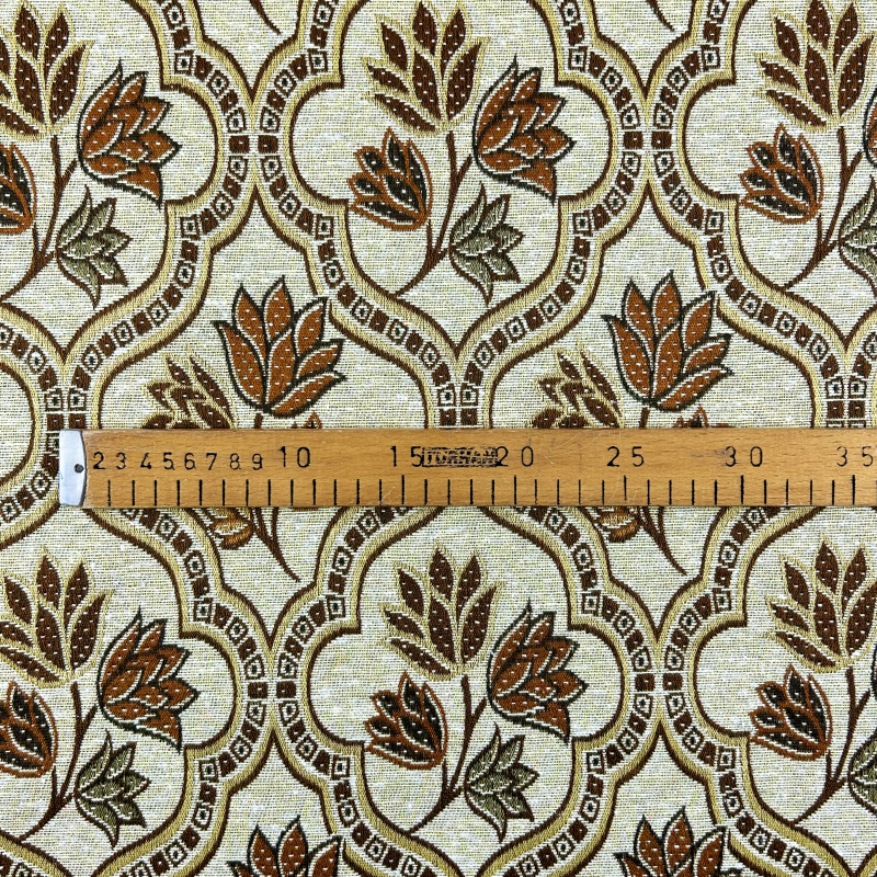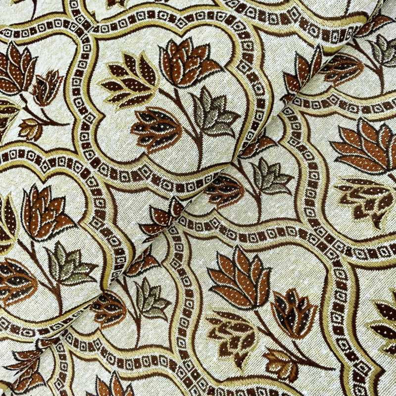 Dekorační/potahová gobelínová látka Asetat je prvotřídní textilie s elegantním a detailním květinovým vzorem. Látka obsahuje oválné medailony s květinovými motivy v odstínech hnědé, které jsou umístěny v složitých ornamentálních rámech. Celkový design působí luxusním a klasickým dojmem, což činí tuto látku ideální pro dekorativní účely nebo jako potahový materiál pro nábytek.