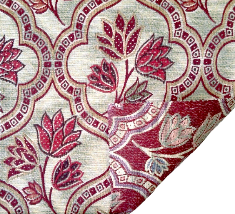 Dekorační/potahová gobelínová látka Asetat - 253 je vysoce kvalitní textilie navržená s důrazem na eleganci a trvanlivost. Tato látka je zdobena složitým květinovým motivem, který kombinuje různé odstíny červené a béžové barvy, což jí dodává klasický a sofistikovaný vzhled. Geometrické tvary okolo květinového vzoru zvyšují její vizuální přitažlivost a přidávají moderní nádech.
