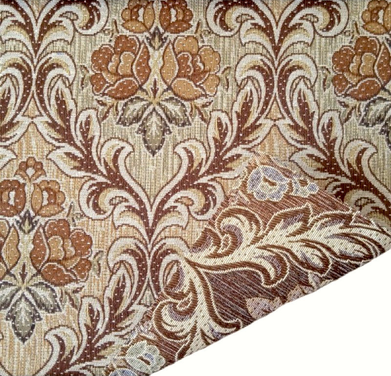 Dekorační/potahová gobelínová látka Asetat - 303 je látka s bohatým květinovým vzorem. Vzor obsahuje velké květy v odstínech hnědé a oranžové barvy, které jsou symetricky uspořádány. Květy jsou obklopeny složitými listovými a křivkovými ornamenty v podobných barvách. Celkový vzhled látky je elegantní a klasický, což ji činí vhodnou pro dekorativní účely nebo jako potahový materiál pro nábytek.