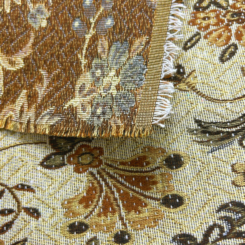 Dekorační/potahová gobelínová látka Asetat je prvotřídní textilie s bohatým květinovým vzorem. Na látce jsou zobrazeny květiny a listy v odstínech hnědé, zelené a žluté barvy, které jsou uspořádány do opakujícího se vzoru. Pozadí látky má jemný geometrický vzor, který dodává látce texturu a hloubku. Tento typ látky je ideální pro dekorativní účely nebo jako potahový materiál pro nábytek, díky svému elegantnímu a klasickému vzhledu.