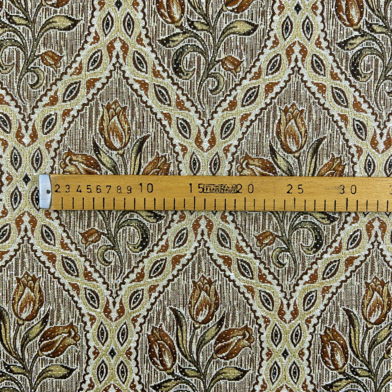 Dekorační/potahová gobelínová látka Asetat - TFY 327 je krásná tkanina, která vyniká svým bohatým a sofistikovaným vzorem. Tento design zahrnuje opakující se motivy květin, konkrétně tulipánů, v odstínech hnědé a zelené. Květy jsou uspořádány do šestiúhelníkových rámců, které jsou lemovány geometrickými tvary v béžových, hnědých a modrých barvách. Toto uspořádání vytváří harmonický a esteticky příjemný vzor, který přitahuje pozornost.