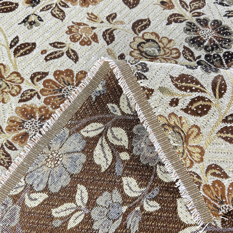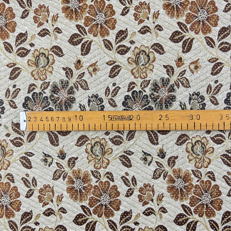 Dekorační/potahová gobelínová látka Asetat - TFY 395 je nádherná tkanina, která vyniká svým bohatým květinovým vzorem. Tento vzor zobrazuje různé květiny v odstínech hnědé, oranžové a černé barvy, které jsou rovnoměrně rozmístěny po celé ploše látky. Květy jsou doplněny listy a menšími kvítky, což vytváří dojem živé zahrady plné barev a textur.