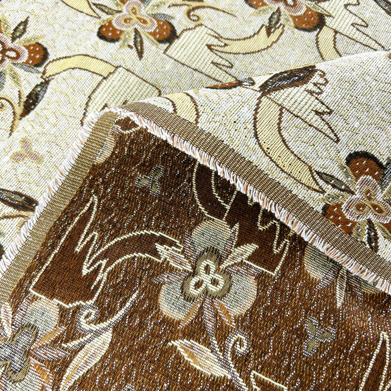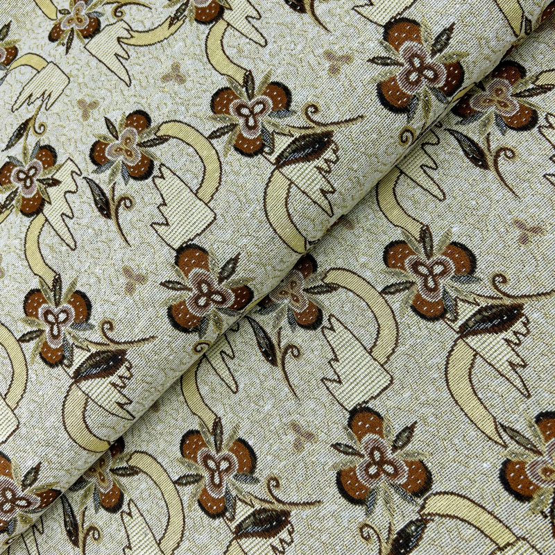 Dekorační/potahová gobelínová látka Asetat - TFY 442 je výjimečná tkanina, která zaujme svým harmonickým spojením květinových a geometrických vzorů. Tento složitý a propracovaný design zahrnuje květiny v různých odstínech hnědé a béžové, doplněné o listy a zakřivené linie. Květinové motivy jsou šikovně propojeny s geometrickými tvary, což vytváří elegantní a esteticky přitažlivý vzor.