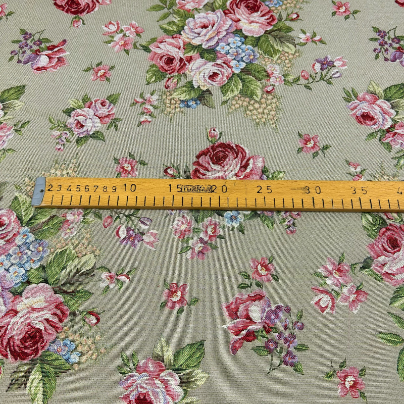 "280cm Dekorační/potahová Gobelínová látka - Letní rozkvet na šedohnědém Tato gobelínová látka o šířce 280 cm je ideální volbou pro všechny, kteří chtějí vnést do svého interiéru nádech elegance a letní atmosféry. Vzor představuje letní květiny v plném rozkvětu, jako jsou růžové a červené růže, modré hortenzie a drobné květy, doplněné zelenými listy. Tyto prvky jsou krásně zobrazeny na šedohnědém podkladu, což látce dodává jemný kontrast a nadčasový vzhled.