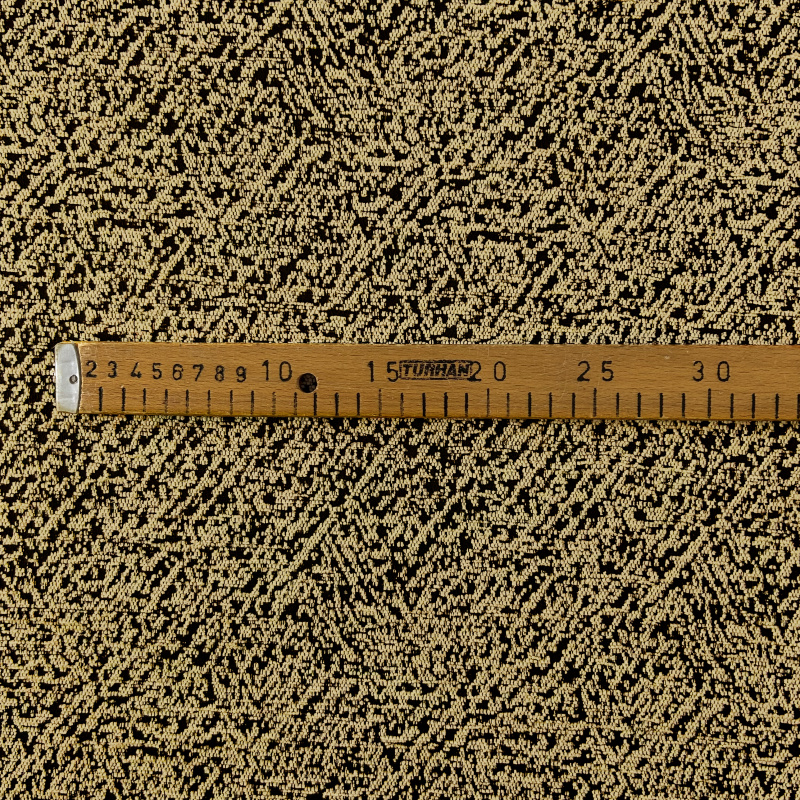 Dekorační/potahová látka DMS - hořčicová je látka s výrazným vzorem, který připomíná drobné tečky nebo skvrny v hořčicově žluté barvě na tmavém pozadí. Tento hustý a nepravidelný vzor dodává látce zajímavý a dynamický vzhled.