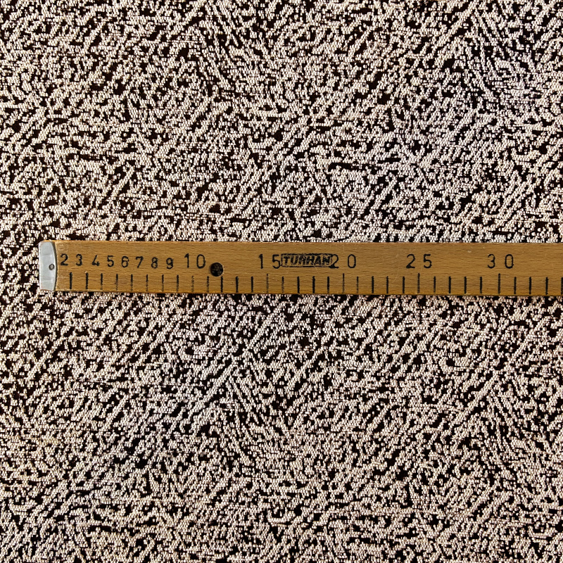 Dekorační/potahová látka DMS - světlo-hnědá je látka s jemným vzorem v světle hnědých odstínech na tmavém pozadí. Tato látka má strukturovaný povrch s drobnými, hustě rozmístěnými tečkami nebo skvrnami, které vytváří detailní a jednotný design.