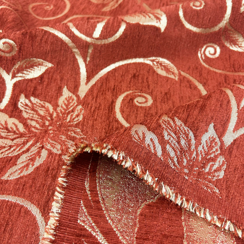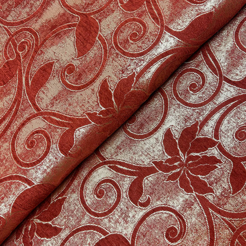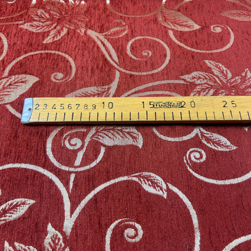 Dekorační/potahová gobelínová oboustranná látka Rekor je látka s bohatým vzorem, který zahrnuje květinové motivy a listy. Látka je v červené barvě s jemným leskem a vzory jsou provedeny ve světlejším odstínu, což vytváří elegantní a luxusní vzhled. Tato látka je vhodná pro dekorativní účely nebo jako potahový materiál pro nábytek, díky své pevnosti a estetickému vzhledu.