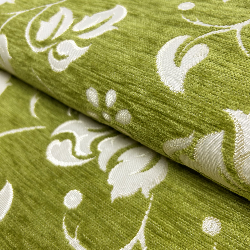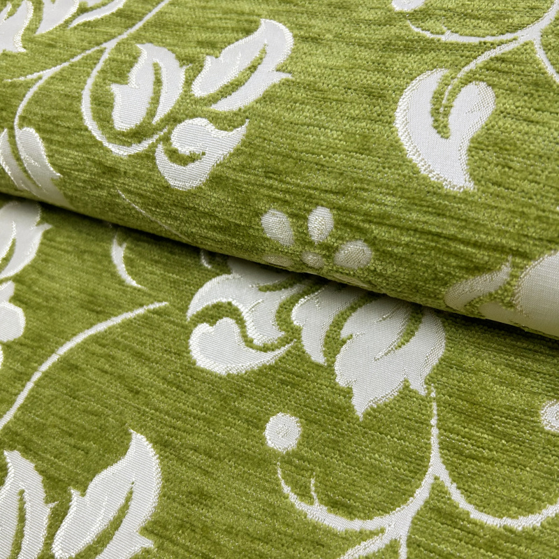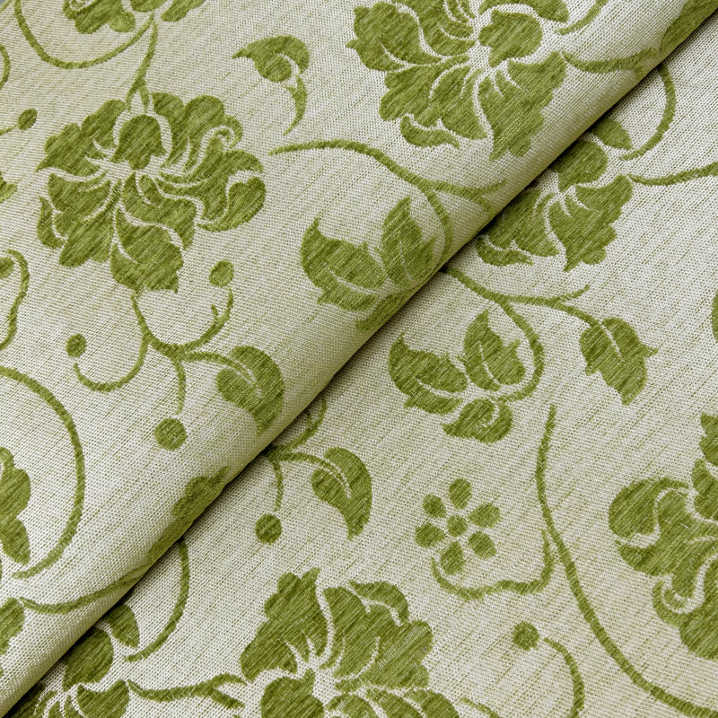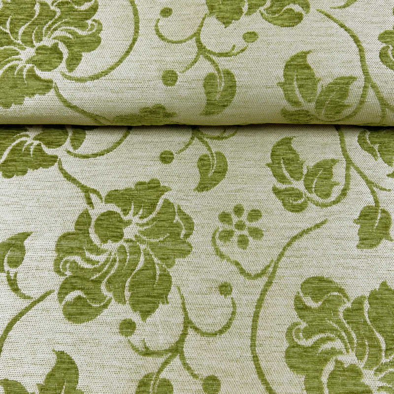 Látka je v zelené barvě s bílým květinovým vzorem, což jí dodává svěží a atraktivní vzhled. Díky své jemné textuře připomínající gobelín je látka vhodná jak pro dekorativní účely, tak pro použití jako potahový materiál na nábytek, jako jsou křesla, pohovky a židle.