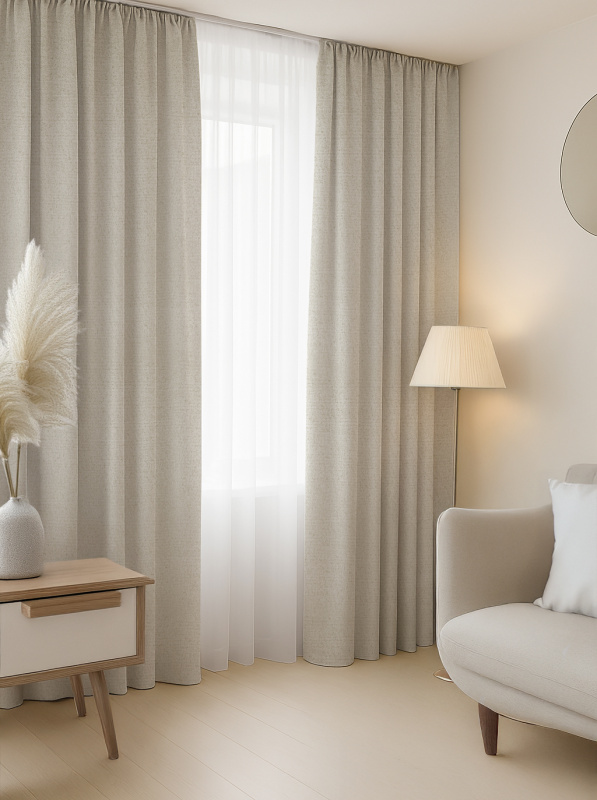 Závěsy jsou kompletně obšité a vybavené univerzální řasící stuhou o šířce 8 cm, vhodnou pro zavěšení na klasické žabky nebo háčky.