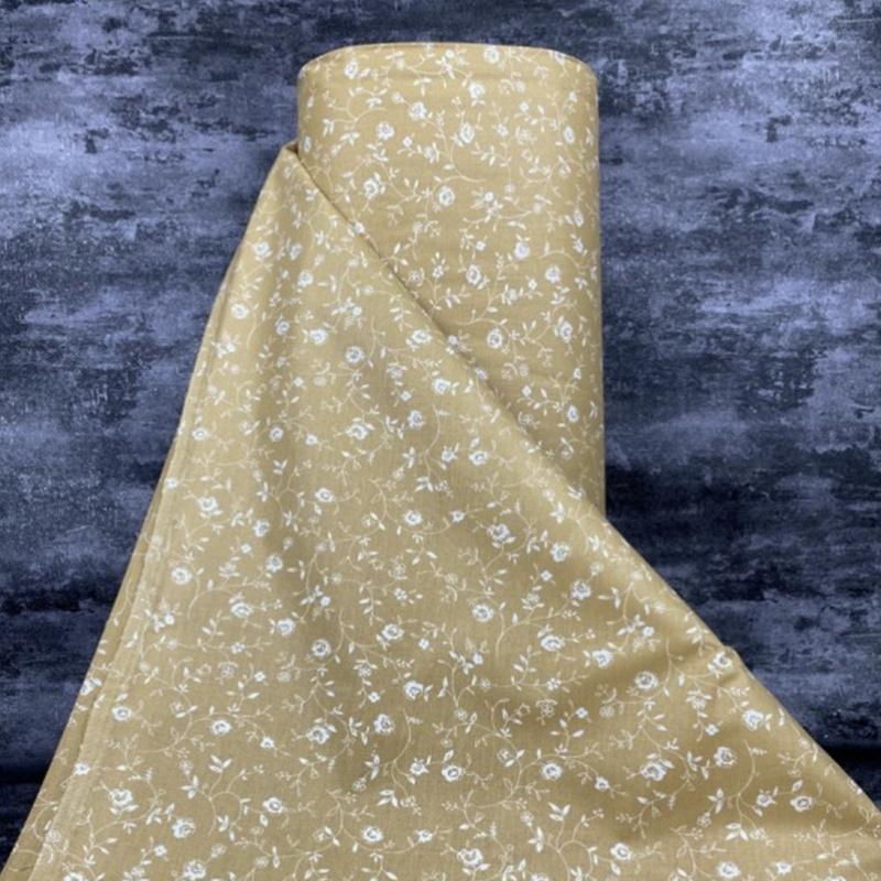 Tato bavlněná látka o šířce 240 cm je zdobena jemným květinovým vzorem. Látka je v hnědé barvě s bílými květy a listy, které tvoří elegantní design. Ideální pro různé textilní projekty, jako jsou závěsy, povlečení nebo dekorativní polštáře.