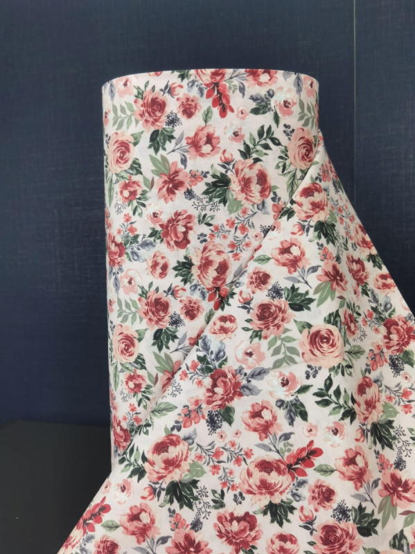 Bavlněná látka šíře 240 cm s motivem kvetoucích červených růží. Vzor zahrnuje různé odstíny červené a růžové barvy květů, doplněné zelenými a šedými listy na světlém pozadí. Ideální pro šití dekorativních předmětů, oděvů nebo bytového textilu.