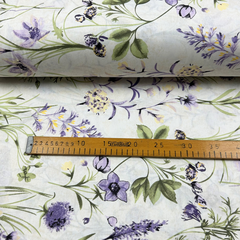 Bavlněná látka s motivem fialové letní louky. Vzor zahrnuje různé květiny v odstínech fialové, žluté a zelené na světlém pozadí. Květiny jsou detailně vykreslené, což dodává látce jemný a elegantní vzhled.