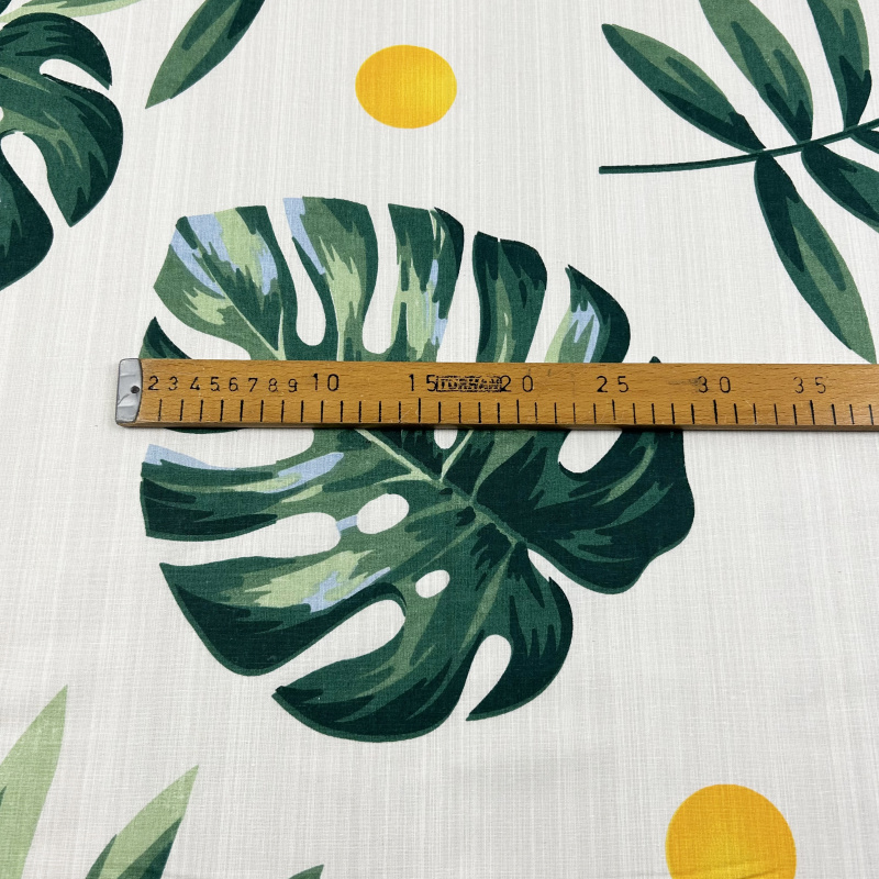"Bavlněná látka šíře 240 cm s motivem listů monstery a palmových listů, doplněná žlutými kruhy. Vzor je na světlém podkladu, což dodává látce svěží a moderní vzhled. Ideální pro výrobu dekorativních předmětů, závěsů nebo povlečení."
