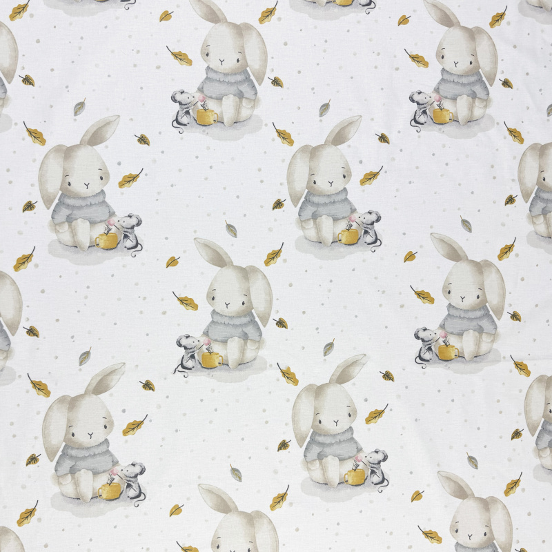 Bavlněná látka šíře 240 cm - Zaječí pohádka (28313-6) je skvělá volba pro kreativní projekty, které vyžadují kvalitu a estetiku. Tato látka zaujme svým půvabným motivem roztomilých zajíčků oblečených v šedých svetrech, kteří se nacházejí v kouzelném prostředí plném myšek s hrníčky a drobných detailů, jako jsou žluté a hnědé lístky. Látka je vhodná na šití ložního prádla, dětských závěsů, povlaků na polštáře, oblečení nebo jiných dekorativních výrobků. Díky šířce 240 cm poskytuje dostatek materiálu pro velké projekty. Vyrobená z kvalitní bavlny, která je měkká na dotek a snadná na údržbu, zajišťuje dlouhou životnost a komfort. Skvělá volba pro každého, kdo chce vnést do interiéru hravost, útulnost a jedinečný styl.