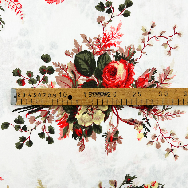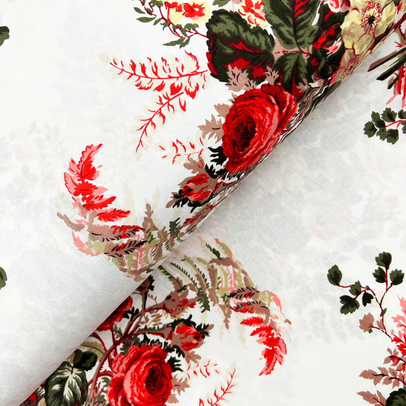 Bavlněná látka šíře 240 cm - Růže a kapradí, metráž. Tato vysoce kvalitní bavlněná tkanina je ideální pro výrobu dekorativních textilií, jako jsou závěsy, ubrusy, povlečení nebo módní doplňky. Design látky tvoří elegantní vzor s červenými růžemi a jemnými zelenými kapradinami na světlém podkladu, což dodává přírodní a sofistikovaný vzhled. Díky šíři 240 cm umožňuje snadné přizpůsobení různým šicím projektům. Látka je příjemná na dotek, odolná a snadno se udržuje, což ji činí skvělou volbou pro stylové a pohodlné domovní textilie. Perfektní volba pro milovníky romantických květinových motivů!