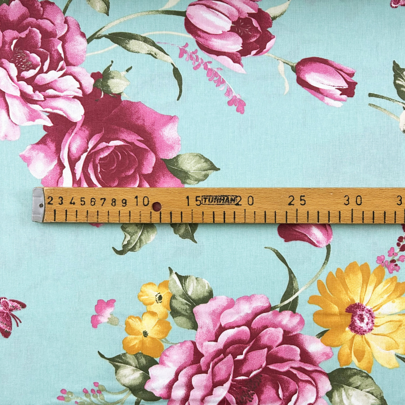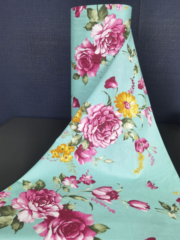 Bavlněná látka o šířce 240 cm s květinovým vzorem na tyrkysovém podkladu. Na látce jsou růžové a fialové květy růží, žluté květy a zelené listy. Vzor je doplněn malými růžovými motýly. Tento barevný a výrazný vzor je ideální pro dekorativní projekty, oděvy nebo bytový textil.