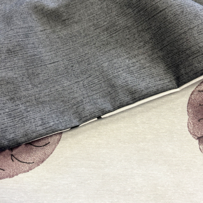z jedné strány akvarelové listy z druhé jednobarevná látka v šedé barvě s malými proužkama.